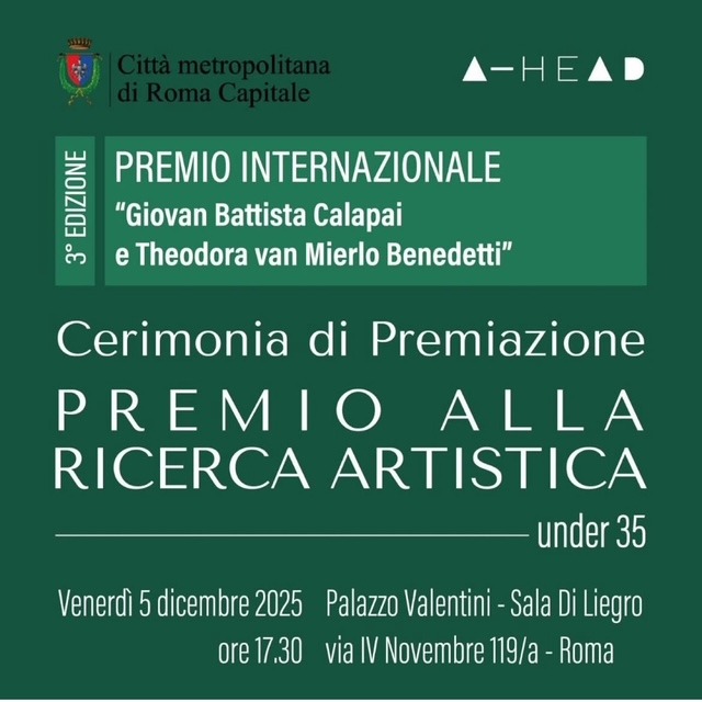 Con il Patrocinio di Città Metropolitana di Roma Capitale, Venerdì 5 dicembre, alle ore 17:30, Palazzo Valentini (Sala Di Liegro – Via IV Novembre 119/A, Roma) ospiterà la cerimonia di consegna della terza edizione del Premio Internazionale “Giovan Battista Calapai e Theodora van Mierlo Benedetti”.