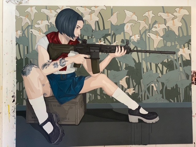 L’immaginario dell’artista piemontese, che vive da anni a Palermo, mette al centro della scena (e visivamente della tela) la figura femminile: l’omaggio totalizzante della sua pittura è nei confronti di un archetipo di donna contemporaneo che va ben oltre i confini del consentito. Ferrigno porta in scena un universo popolato da donne tatuate, ribelli, armate: sono guerriere contemporanee, donne che scelgono di difendersi autonomamente, di andare oltre le difficoltà, affermando il proprio valore.