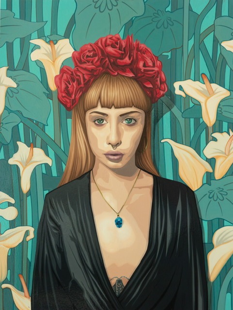 L’immaginario cinematografico di Quentin Tarantino e Robert Rodriguez attraversa le tele di Ferrigno: le sue eroine sembrano uscire direttamente da un film pulp, sospese tra ironia e dramma, tra gioco e sfida, tra realtà e sogno. Le reminiscenze di viaggio sudamericane prendono vita nel ciclo di ritratti Sinibaldi, dove l’iconografia è un ribaltamento dell’immagine religiosa convenzionale, in un sincretismo che ricorda la figura della Santa Muerte e la donna botticelliana.