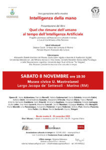 Sabato 8 novembre alle ore 18.30, presso il Museo Civico “U. Mastroianni” di Marino (RM), si inaugura la mostra Intelligenza della mano con la presentazione del libro, edito da Bordeaux,Quel che rimane dell’umano al tempo dell’Intelligenza Artificiale, che prende il nome dal progettopromosso dall’Associazione culturale in tempo, a cura di Ida Mitrano e Rita Pedonesi. L’evento ha ilPatrocinio del Comune di Marino e il sostegno della Fondazione Franz Ludwig Catel. Oltre ai saluti istituzionali del Sindaco Stefano Cecchi e dell’Assessore alla Cultura Pamela Muccini, intervengono il direttore del Museo Alessandro Bedetti, le curatrici del progetto, Giulio Latini,regista e docenteuniversitariodi audiovisivi digitali, che ha curato il ciclo di incontri sull’IA e Carmela Morabito, docente universitaria di Storia della Psicologia e delle Neuroscienze cognitive.